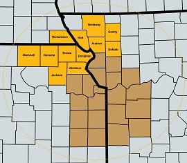 Territory: Kansas: Atchison, Jackson, Doniphan, Brown, Nemaha, and Marshall Counties - Missouri: Holt, Andrew, DeKalb, Nodaway, and Gentry Counties - Nebraska: Richardson County